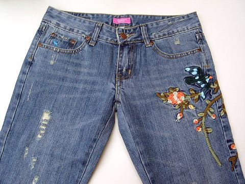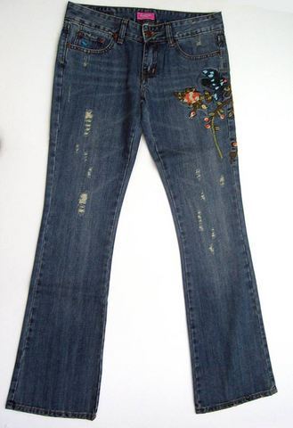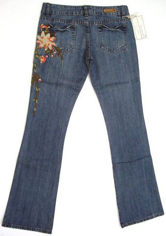 These are ladies tapered leg jeans with a bit of flair at the bottom, the decoration includes a hand-stitched multi-colored bird/floral design on the left side (mostly yellow/orange flowers, with one blue bird on the front side). Stress marks may vary depending on which size you buy.